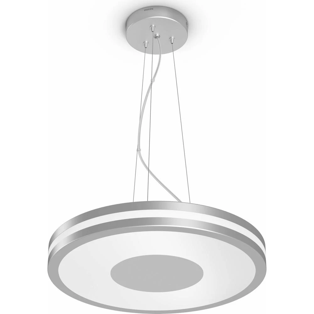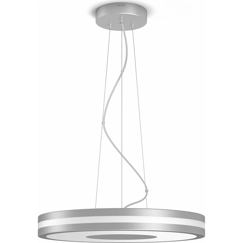 Die Being-Serie von Philips Hue ist aus robustem Kunststoff und Metall gefertigt. Die silberne Farbgebung verleiht der Pendelleuchte eine edle Optik und sorgt fĂĽr ein elegantes Ambiente in jedem Raum.