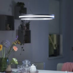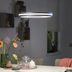 mit einer Energieeffizienzklasse von F. Die Lichtfarbe kann von warmem Weiß (2200 K) bis zu hellem Tageslichtweiß (6500 K) individuell eingestellt werden. Mit einem Lichtstrom von 2900 lm und einem Farbwiedergabeindex von über 80 bietet die Pendelleuchte eine angenehme Beleuchtung für jeden Raum. Dank einer Lebensdauer von 25000 Stunden und 50000 Schaltzyklen wird die Umwelt zuverlässig geschont.