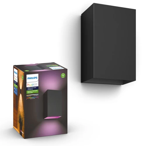 Mit dieser Philips Hue Resonate Außenwandlampe Schwarz Dreierpack sorgst du für stimmungsvolle Beleuchtung in deinem Garten. Befestige diese Wandlampen an der Wand oder am Zaun und wähle in der Hue-App das Licht aus, das zu deiner Aktivität passt. Zum Beispiel warmes Licht, wenn du dich entspannen möchtest, oder farbenfrohes Licht während einer Gartenparty. Die eingebauten LED-Lampen liefern Licht in 16 Millionen Farben und allen Weißtönen. Die Beleuchtung lässt sich über die Hue-App bedienen. Damit kannst du auch festlegen, dass die Lampen automatisch eingeschaltet werden, wenn du nach Hause kommst. Oder du koppelst die Lampe an den Sonnenuntergang, damit dein Garten immer beleuchtet bleibt.